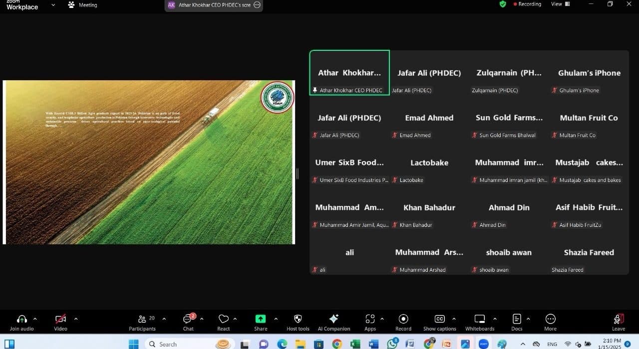 (15-01-2025) Pakistan Horticulture Development and Export Company (PHDEC) organized 2nd interactive session to engage major stakeholders and entrepreneurs involved in the value addition of agro products. The session aimed to provide insights into the upcoming FoodAg Manufacturing Expo, scheduled to be held from 26th to 28th February 2025 in Lahore, organized by the Trade Development Authority of Pakistan (TDAP).
