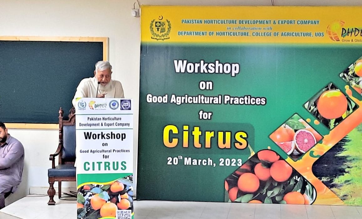 Pakistan Horticulture Development & Export Company in collaboration with University of Sargodha organized a workshop on “Good Agricultural Practices of Citrus for better Quality & Yield” in Sargodha. Around 150 participants including farmers/growers, processors, R&D, and academia physically and 20 persons on zoom attended the workshop.