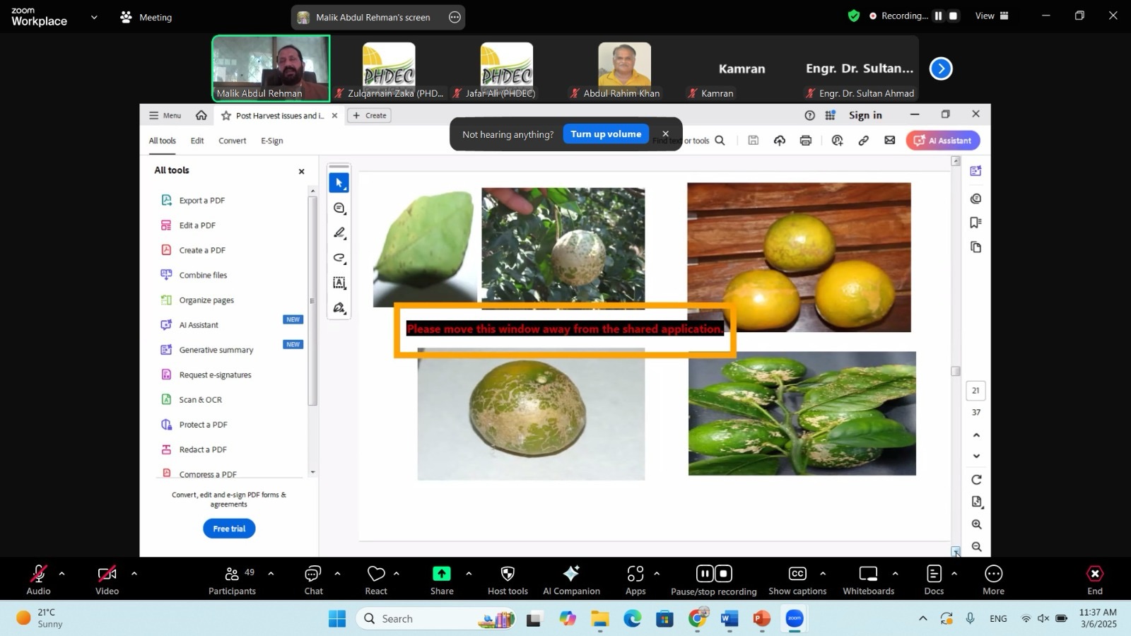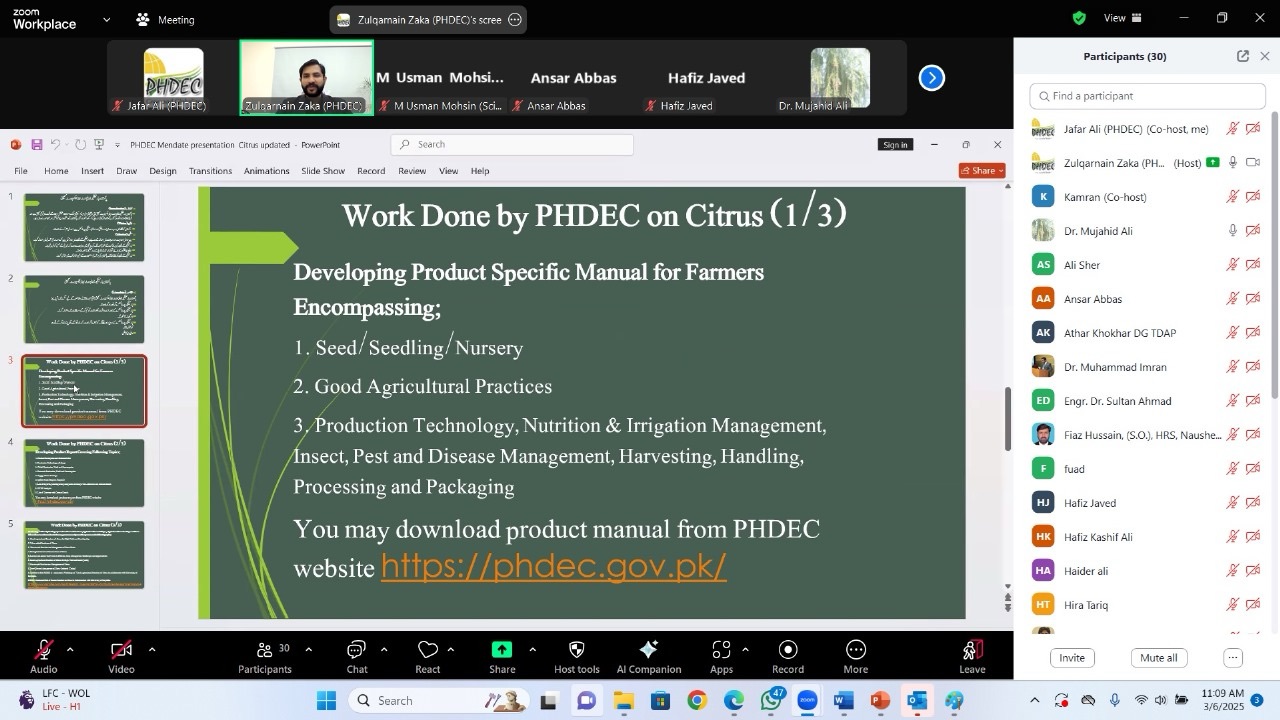 Today (06 March 2025), PHDEC conducted a webinar on the “Postharvest Management of Citrus Orchards” to enhance yield and improve fruit quality. Citrus holds a significant position in Pakistan’s fruit production, with an annual output of approximately 2.4 million metric tons (MMT). Kinnow remains the dominant variety grown in the country. However, Kinnow exports have been declining due to quality concerns and low yields, largely attributed to insect and pest infestations and a lack of awareness among farmers regarding good agricultural practices.