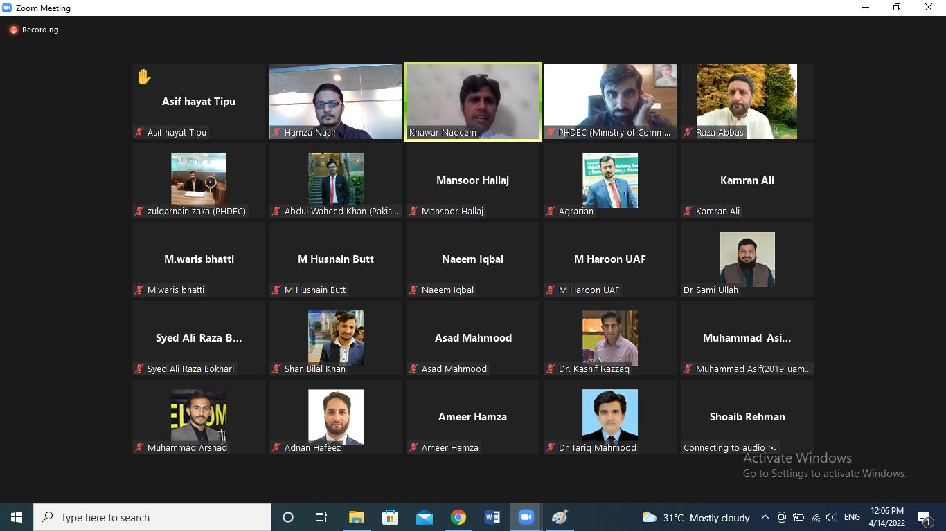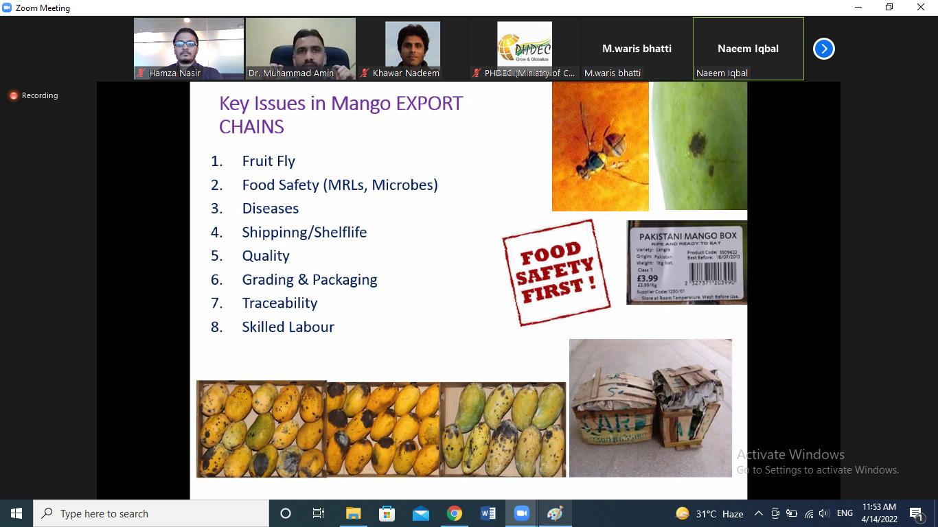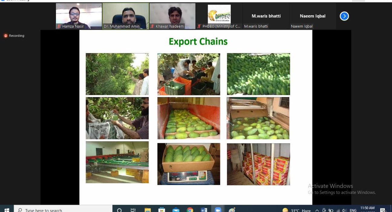 Pakistan Horticulture Development & Export Company held an online pre-season seminar on mango wherein the current burning issues of mango sector such as harvesting, handling and transportation were discussed at large. The seminar was delivered by Dr. Muhammad Amin from The Islamia University of Bahawalpur Pakistan. The seminar was attended by participants from University of Agriculture Faisalabad – Official, mango growers from Punjab and Sindh, processors etc. The seminar will enable stakeholders to prepare their produce in line with the International standards resulting in expansion of mango exports from Pakistan.