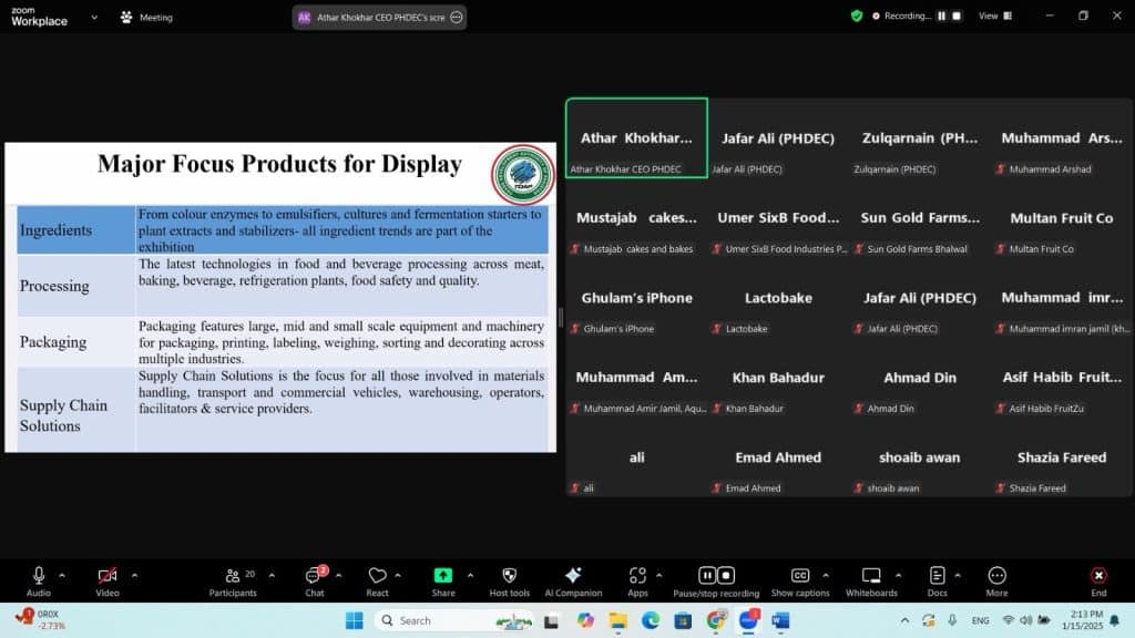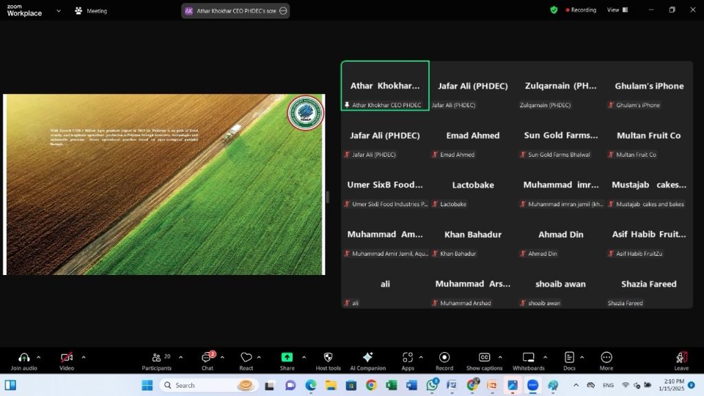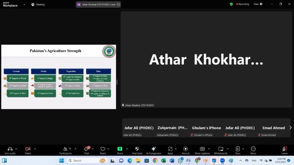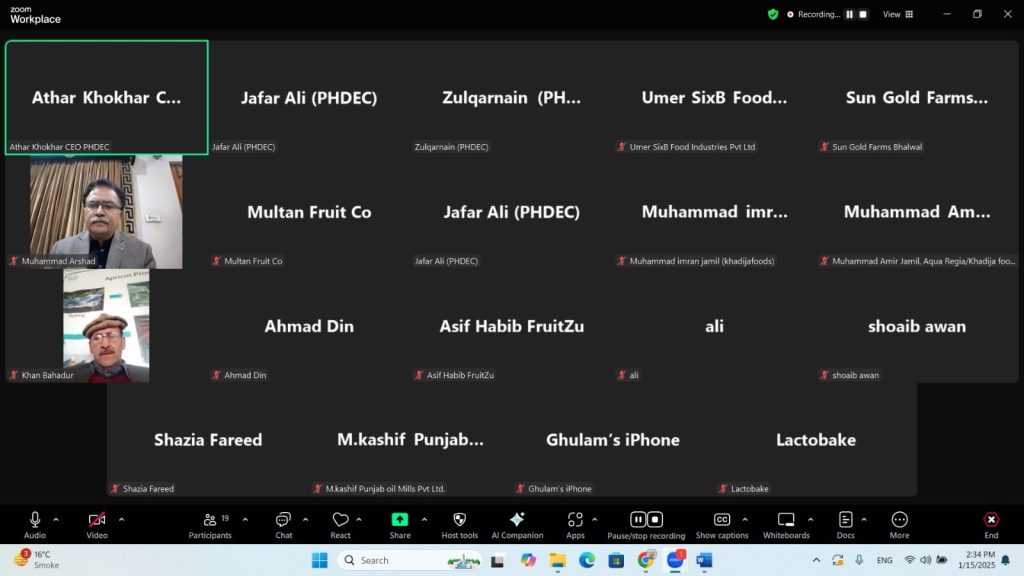 Today (15-01-2025) Pakistan Horticulture Development and Export Company (PHDEC) organized 2nd interactive session to engage major stakeholders and entrepreneurs involved in the value addition of agro products. The session aimed to provide insights into the upcoming FoodAg Manufacturing Expo, scheduled to be held from 26th to 28th February 2025 in Lahore, organized by the Trade Development Authority of Pakistan (TDAP).