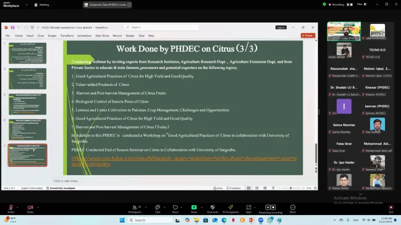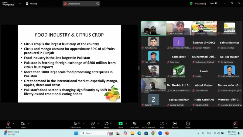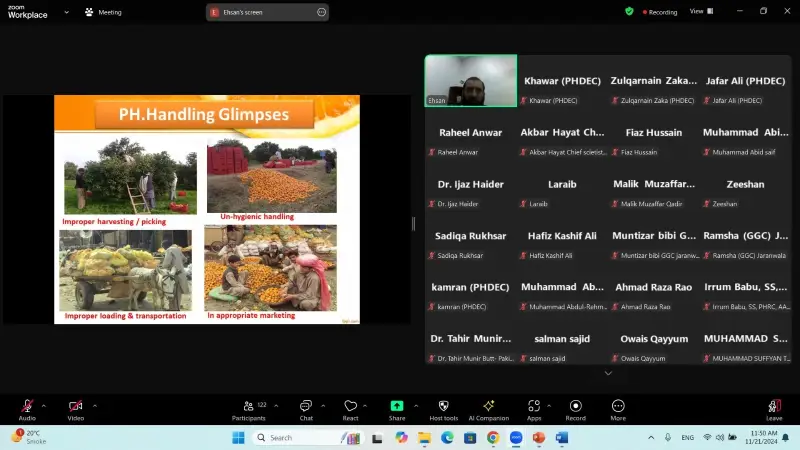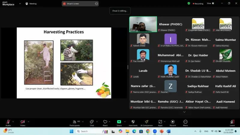 Today (November 21, 2024), PHDEC conducted a webinar on “Harvest and Post-harvest Management of Citrus Fruits”. The aim was to discuss harvesting, post-harvest handling of citrus to minimize the post-harvest losses and availability of premium quality citrus in domestic and international high-end-markets. The harvesting of citrus is in progress and will continue till the end of March. Citrus is more sensitive and responsive towards mishandling and malpractices of harvesting and post-harvesting. Keeping this in view, PHDEC aimed to educate farmers, key farm workers on proper harvest, postharvest handling, processing, packing, storage and transportation of citrus fruit for exports. A large number of participants from growers, processors, exporters, R&D, and academia participated in the webinar and appreciated the PHDEC’s initiative for conducting the webinar on the important topic of harvest & post-harvest management.
