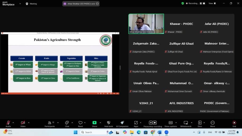 (08-01-2025) Pakistan Horticulture Development and Export Company (PHDEC) organized an interactive session to engage major stakeholders and entrepreneurs involved in the value addition of agro products. The session aimed to provide insights into the upcoming FoodAg Manufacturing Expo, scheduled to be held from 26th to 28th February 2025 in Lahore, organized by the Trade Development Authority of Pakistan (TDAP).