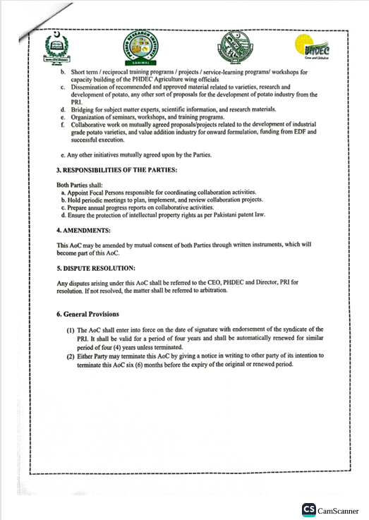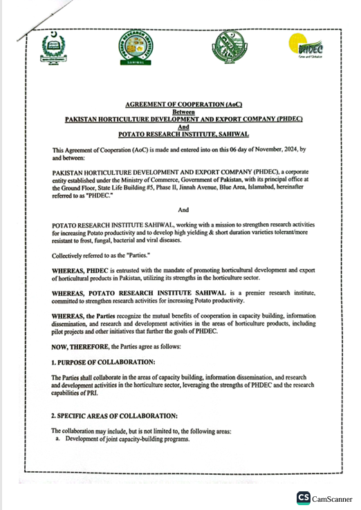 MoU with Quaid-i-Azam University, Islamabad: We’re thrilled to announce a groundbreaking collaboration between the Pakistan Horticulture Development & Export Company (PHDEC) and Potato Research Institute, Sahiwal!