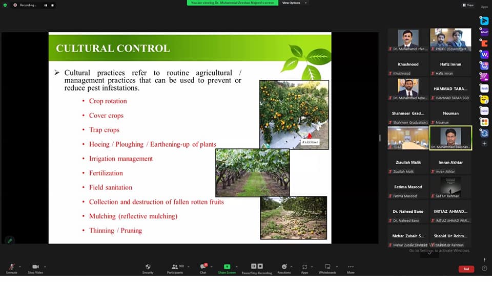 Today (April 13, 2023) a Webinar on Biological Control of Insects, Pests of Citrus was organized by Pakistan Horticulture Development & Export Company (PHDEC) in collaboration with the Department of Horticulture, and Department of Entomology, College of Agriculture, University of Sargodha. A large number of participants participated in this Webinar via zoom link. Experts from the Department of Horticulture, UOS discussed the following in detail: